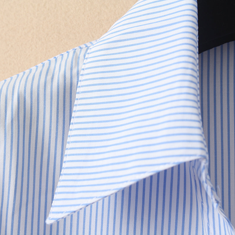 - Style: Shirt style top with V-shape open collar, no button at the collar level. Please note the shirt top is tapered at the waist and there are darts at both the front and back. Also, the length of the cuffs is longer than usual.