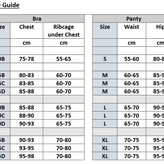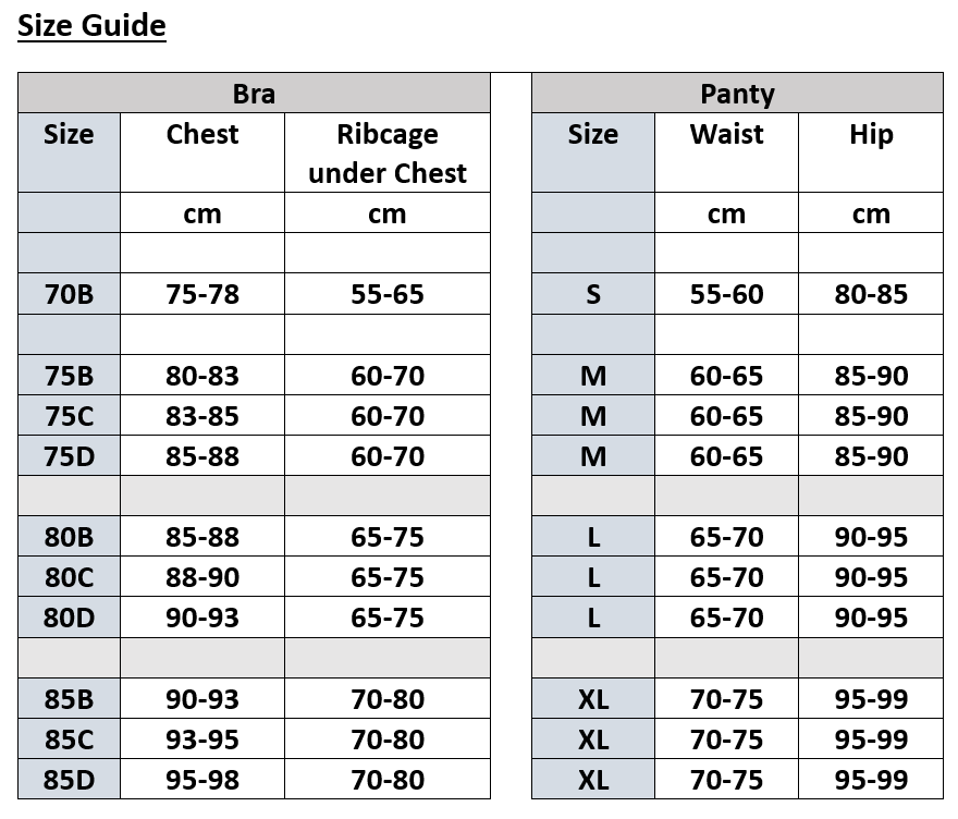 Please note these sets are sold with fixed panty and bra matching sizes as specified in our Size Guide. That is, a particular size bra pairs with a pre-determined size of panty as a set. We are unable to cross match the sizes between the bras and panties. For instance, a bra size of 75 is sold as a set with M size panty.