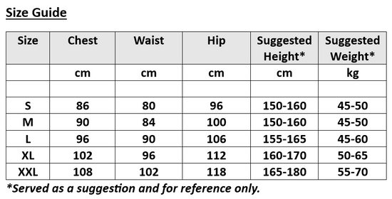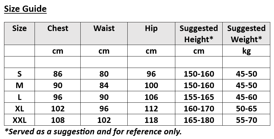 Sizes: Please see the Size Chart in the picture section for your reference and note that the sizes stated in the Size Chart may be smaller than the usual same sizes of S, M, L & XL in the US/Europe. Please do read the measurements.